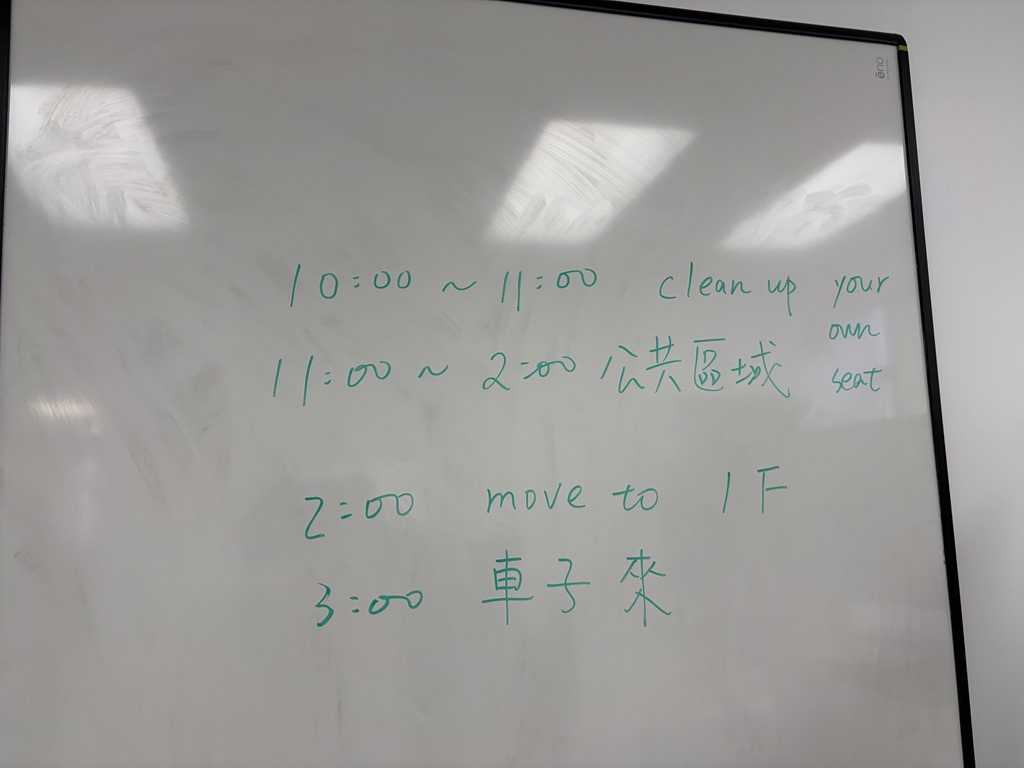 我當然懂員工面面相覷的臉,明明我不是穿著小禮服來打掃!接過CTO的第二句話,「白板上是今天的行程和目標,我需要大家先清理每個人自己的區域,接下來有空的人就往公共區域清理。我了解這裡有三個部門,請每一個部門的員工,負責自己部門的整理。垃圾往門口堆,2點開始我們把要丟的東西往樓下搬,3點卡車會來清理垃圾。另外,冰箱裡屬於你們的私人食物請先拿回位置上,等一下我們也要清冰箱~~」