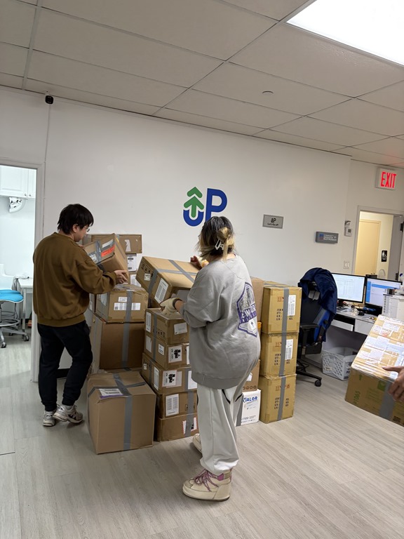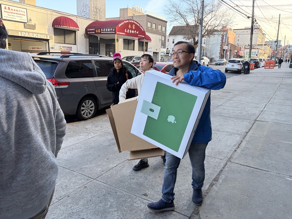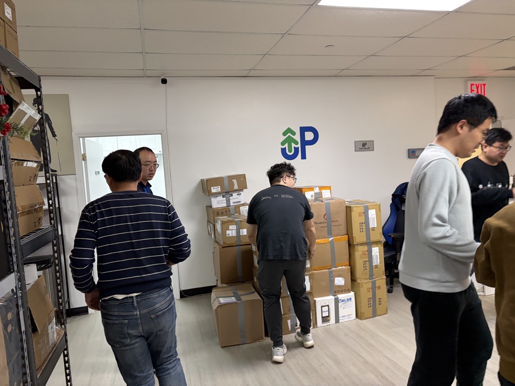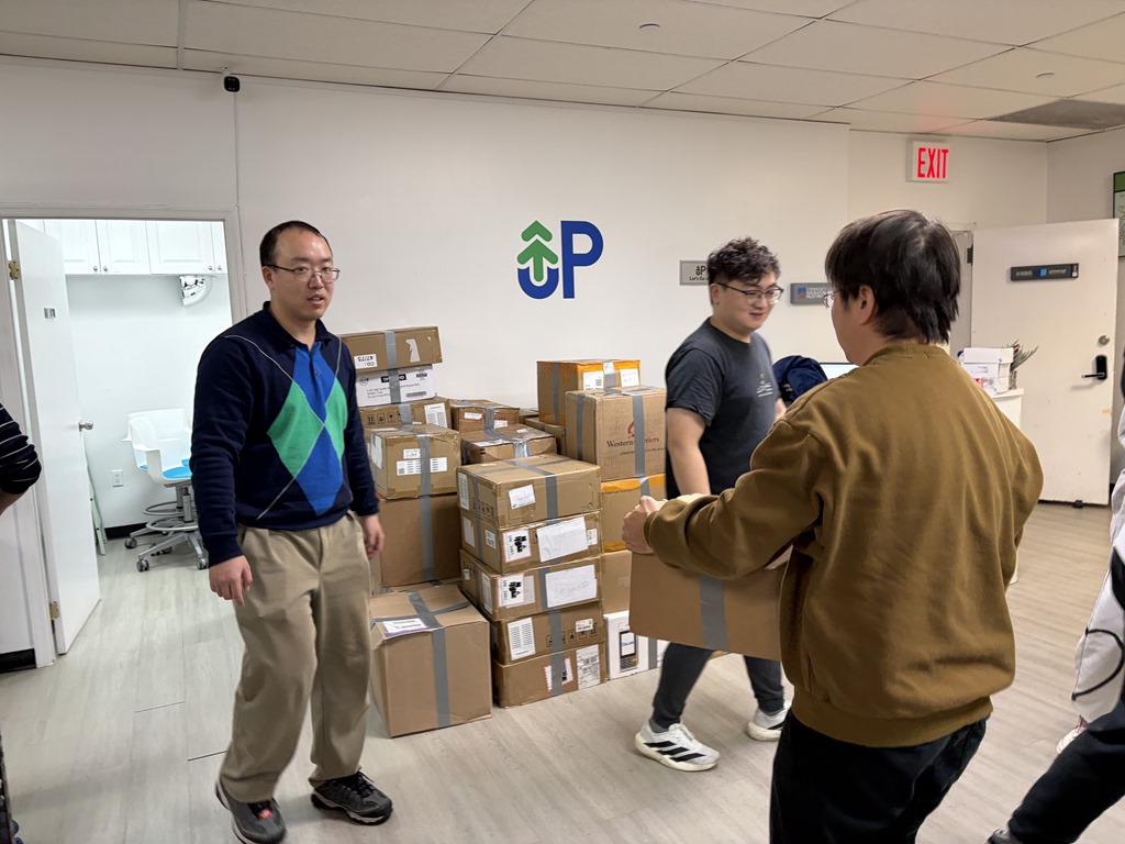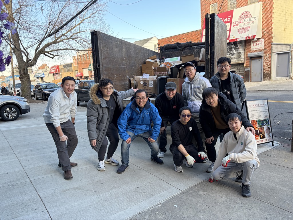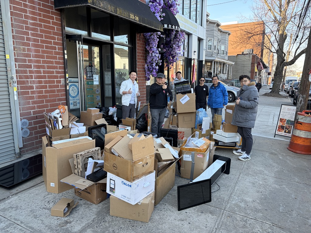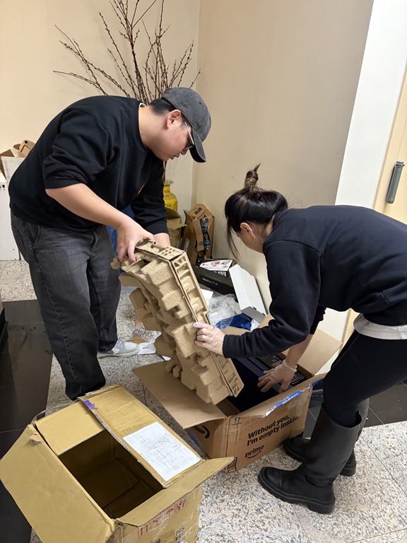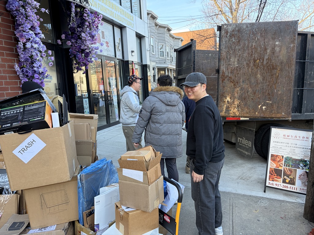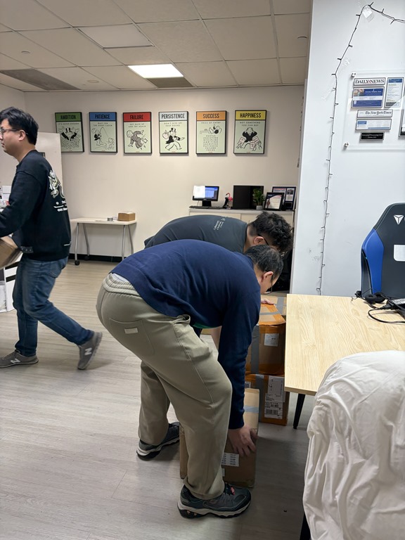 大男生們二話不說,一箱接一箱的把貨搬到牆邊。