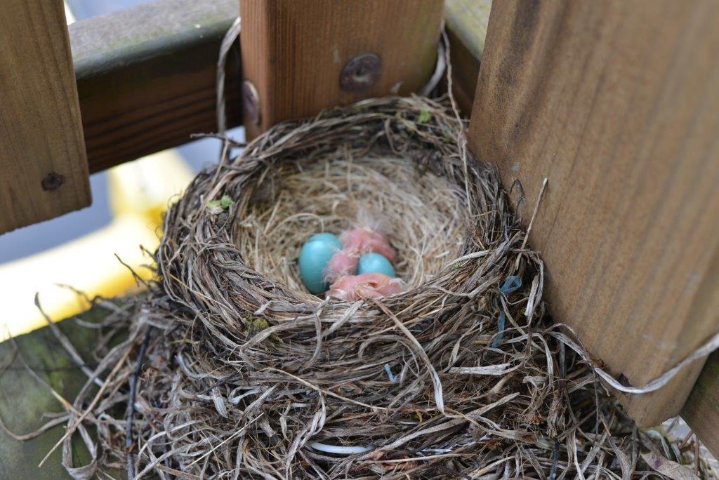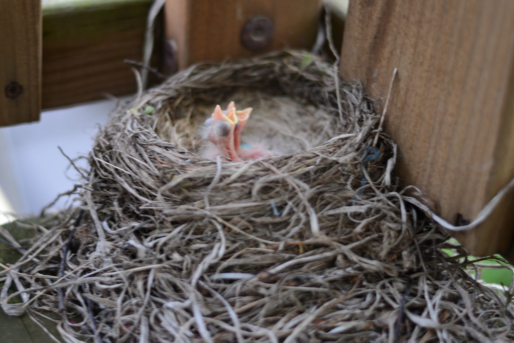 也許知更鳥媽媽老早就下好蛋了!只是我們一直太忙,沒有發現…但從星期天我們發現漂亮的藍色鳥蛋,到星期三下午出門前,我一直知道鳥媽媽不停的翻轉鳥蛋,似乎是要讓四顆蛋的温度平均,只是小鳥寶寶還未現蹤跡。宇眉和我才開起電腦,就看到螢幕上漂亮的藍色旁,多出了蠕動的粉紅色身體…我兩大喊一聲,小鳥出生了!宇眉顧不得全身溼答答,我也顧不得大包小包的游泳配備,掉頭就衝出家門,一刻沒停的爬上溜滑梯。這是千載難逢的好機會,剛出生的鳥寶寶,加上不在的鳥媽媽,我們這堂自然課,真是太特別了!