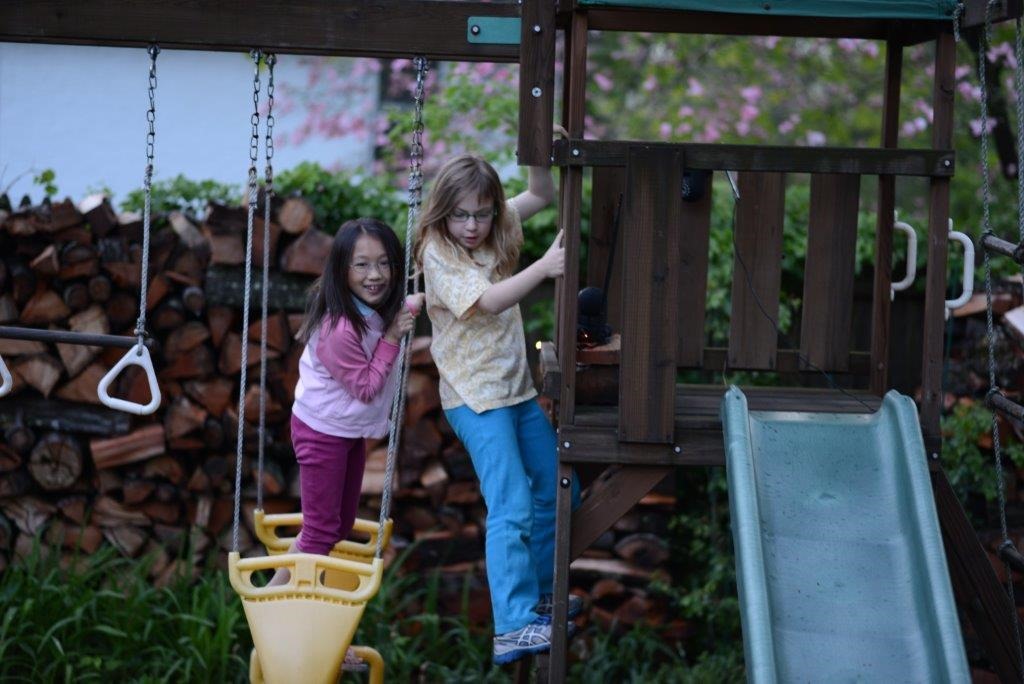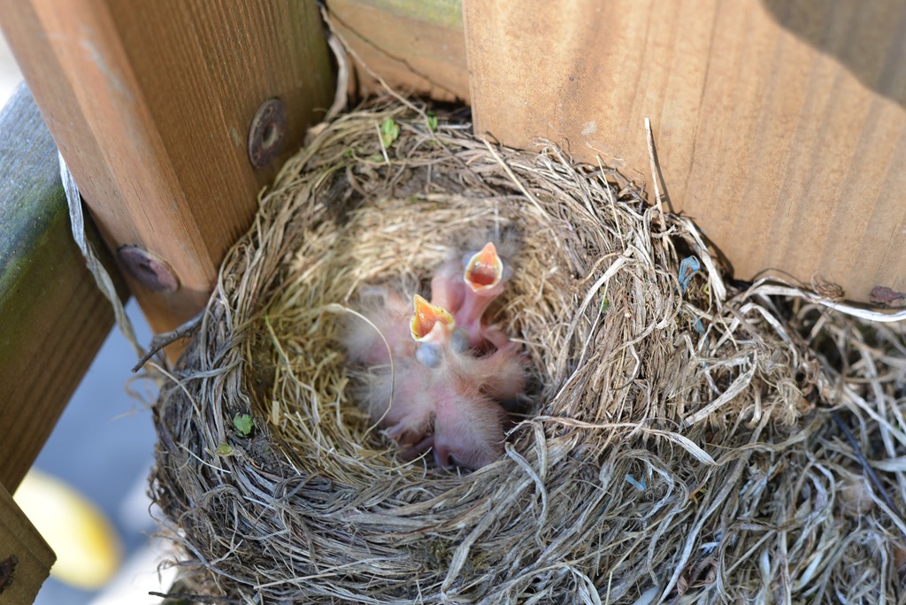孩子們就是這樣,爬上溜滑梯觀察鳥媽媽建築在木頭平面的鳥巢。
