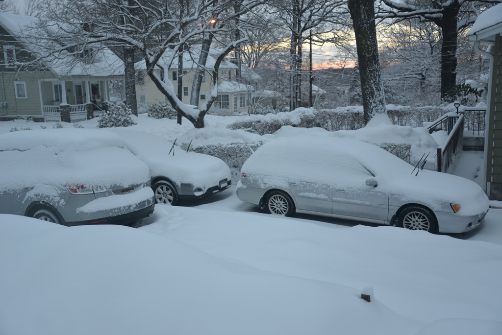 睡覺前鄰居才清好的車道和車,又被一晚的大雪覆蓋。我想,她一定欲哭無淚,要是我剷了三個鐘頭的雪,隔天肯定是個廢人。