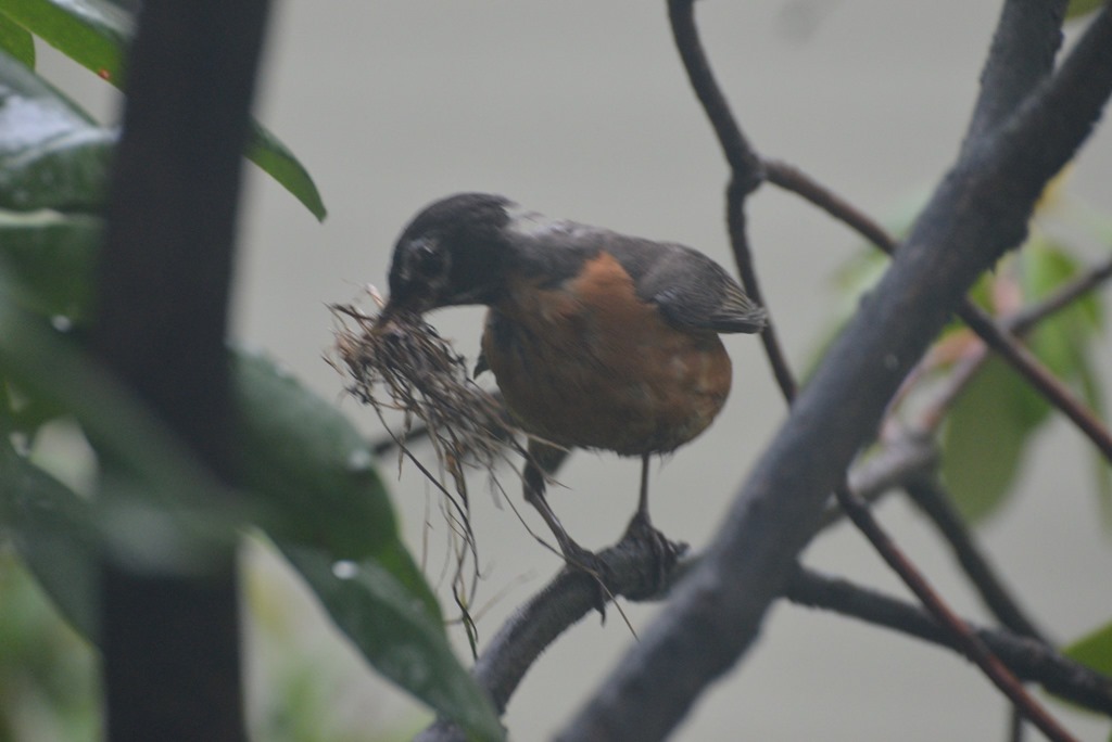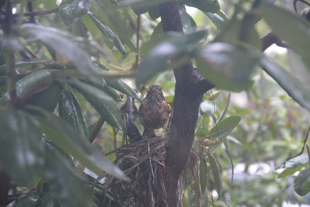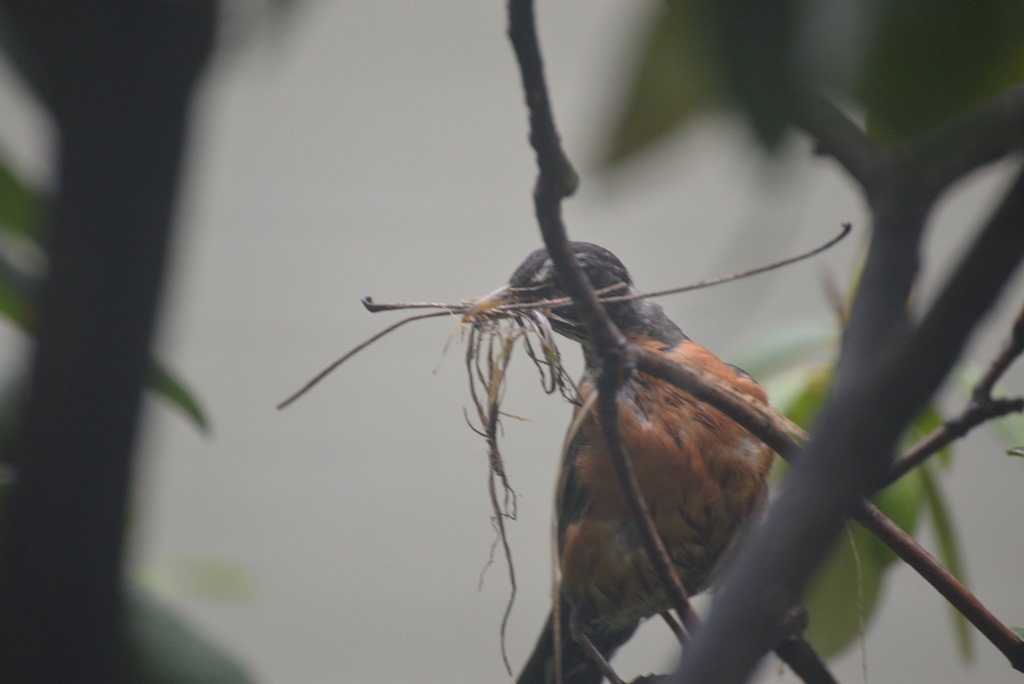 我非常容易著迷於某件事,然後就會像瘋子一樣,非把它做好不可。知更鳥三十二小時可以完成築巢的工作,我打定主意要記載下這難得的畫面,從無到有。這時,老公的專業相機非常管用,只是重量實在太重,我站的腳酸、拿的手酸,還是不願放棄這難得的鏡頭。